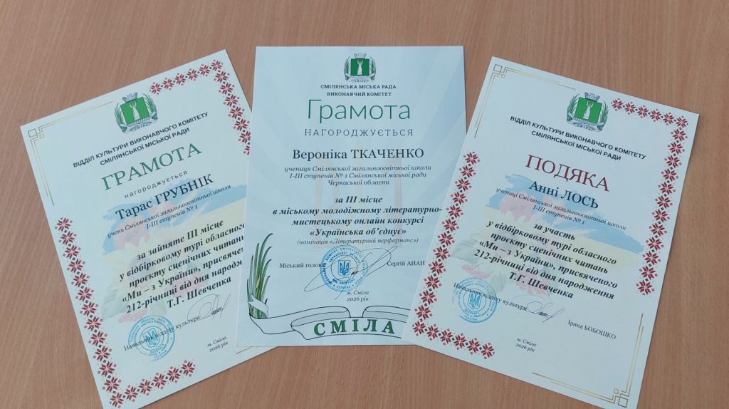 Учні Нашої Першої взяли участь у міському молодіжному літературно-мистецькому онлайн-конкурсі "Україна об'єднує" та у відбірковому турі обласного проєкту сценічних читань "Ми - з України". Ткаченко Вероніка, учениця 9А класу, посіла ІІІ місце в онлайн- конкурсі "Україна об'єднує", Лось Анна, учениця 5А класу, стала лауреатом у проєкті сценічних читань "Ми - з України", а Грубнік Тарас, учень 9Б класу, посів ІІІ місце.